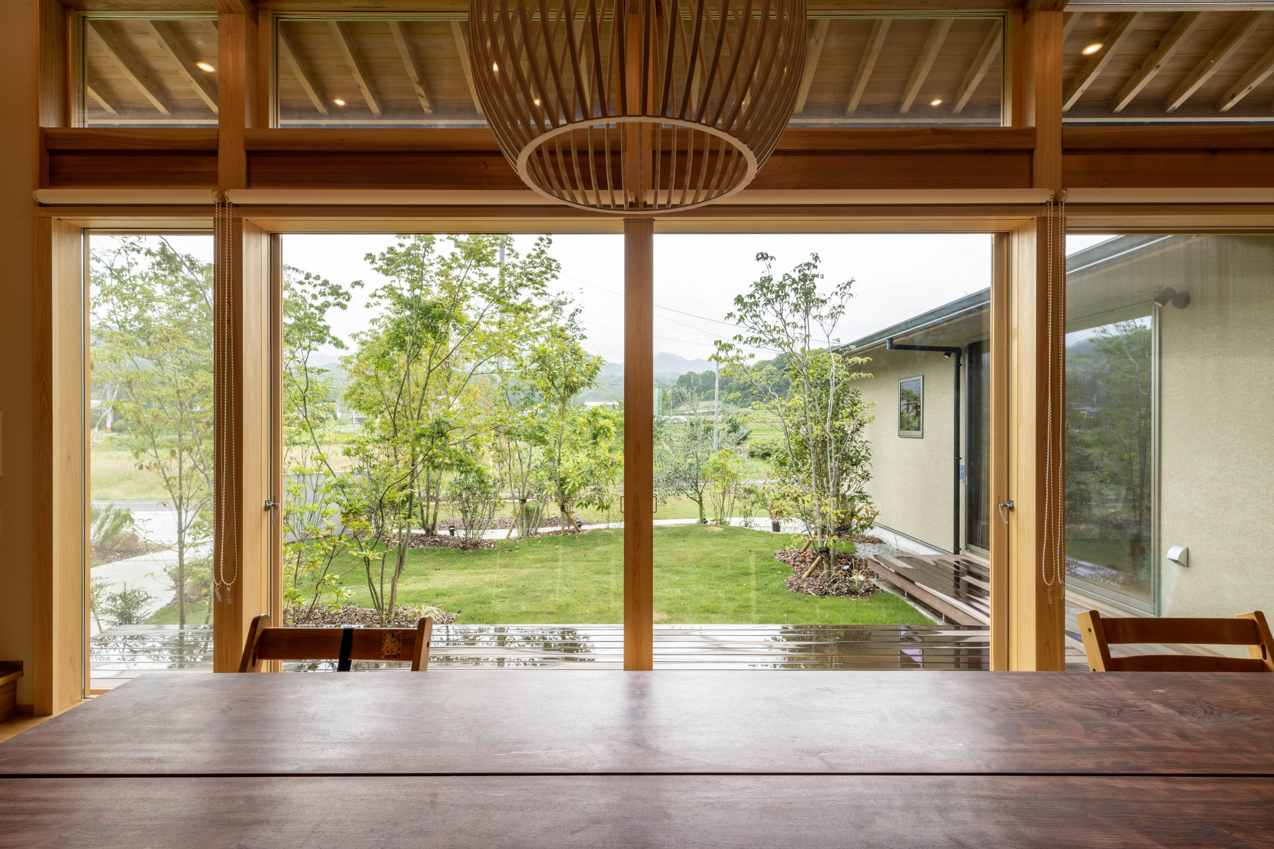 LDKの1面を使った大きな窓から、デッキ、庭、そして遠くの山々まで続く雄大な情景までも暮らしに取り入れています。