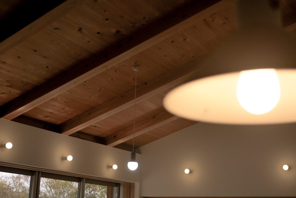 また、大開口の窓と勾配天井が室内をより広く感じさせ、やわらかな光をたっぷりと取り込みます。